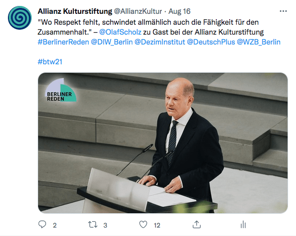 Wenige Wochen vor der Bundestagwahl 2021 lud die Allianz Kulturstiftung gemeinsam mit Partnerinstitutionen aus Wissenschaft, Kultur und Zivilgesellschaft die Kanzlerkandidat*innen Annalena Baerbock (Bündnis 90/Die Grünen), Armin Laschet (CDU) und Olaf Scholz (SPD) zu den Berliner Reden: Für einen neuen Gesellschaftsvertrag ein. Die Veranstaltungsreihe – nach Grundsatzreden des jeweiligen Hauptgastes folgte eine Podiumsdiskussion mit den Vorsitzenden von DIW, DeutschPlus, WZB und DeZIM – sollte seitens der Allianz Kulturstiftung inhaltlich und grafisch einheitlich vorbereitet und begleitet werden. Kern meiner Aufgaben war, neben der Erstellung von Social Media Postings, Newslettern und Einladungslayouts, vor allem die Live-Berichterstattung über den Twitter-Kanal der Stiftung, in Zusammenarbeit mit Fotograf Marcel Wogram und der Kommunikationsabteilung des Hauses. Ein Leistungsauszug: